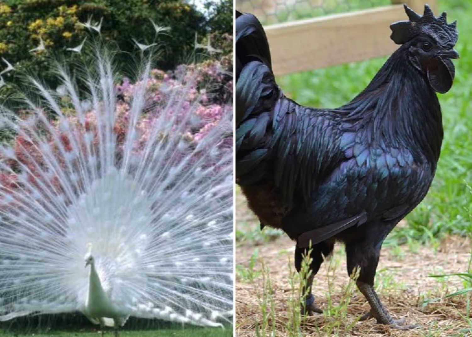 Ce coq est complètement noir, à l’extérieur, mais aussi à l’intérieur; même ses os sont noirs! Cette espèce possède un gène dominant qui provoque une hyper-pigmentation, d’où sa couleur sombre.