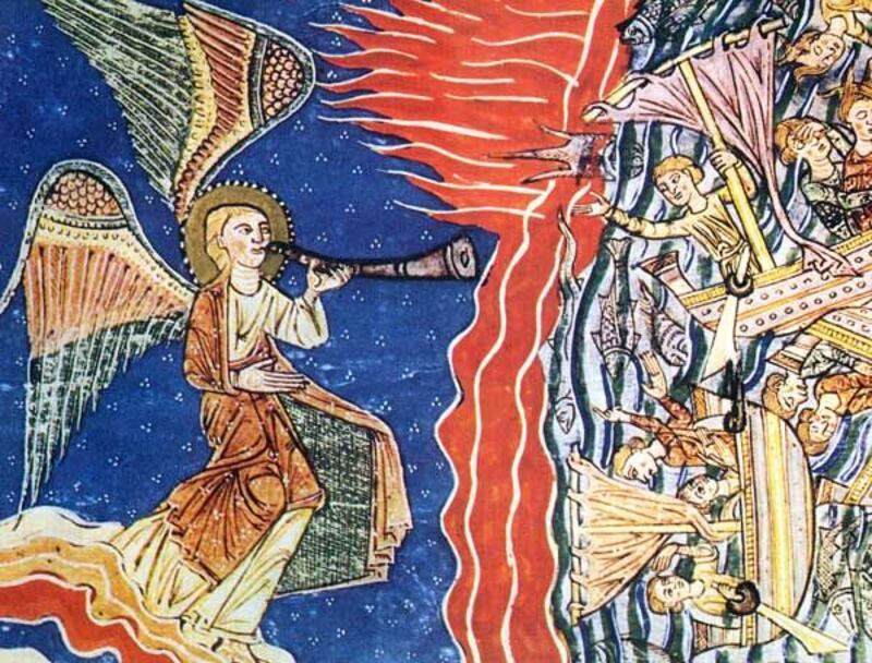 L’Apocalypse de Saint-Jean est une histoire qui se termine bien, c’est l’allégorie du bien qui l’emporte sur le mal : un ange descend du ciel, saisit le dragon, le vieux serpent, qui est le Diable et Satan, et l’enchaîne pour mille ans. Dieu revient alors sauver l’humanité via son fils Jésus, sous une terre et un ciel nouveaux. Amen. * Sur la photo, une enluminure du 12e siècle représentant Le fléau de l'eau, dans l'Apocalypse selon Jean.