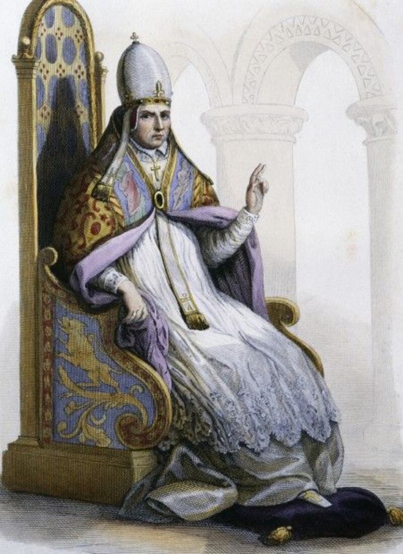 Sa funeste prédiction a fait naître bien des émeutes partout en Europe et a fait fuir de nombreux pèlerins vers Jérusalem. * Sur la photo, une gravure colorée du 19e siècle représentant le pape Sylvestre II, né Gerbert di Aurillac à Rome, vers 950, et devenu pape à partir de 999.