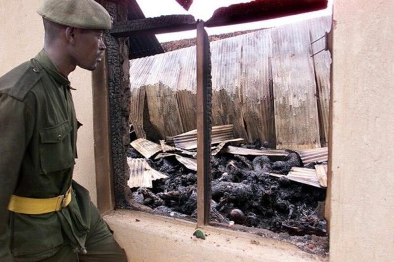 Une fois passée la date fatidique sans que le ciel ne leur soit tombé sur la tête, les adeptes se sont sentis floués et plusieurs ont demandé à être remboursés. Ce que l’on a d’abord cru être un suicide de groupe a fini par ressembler à une tuerie orchestrée par les chefs du culte dans un effort pour se débarrasser des maillons faibles de leur secte. * Sur la photo, prise à Kanungu, en Ouganda, un soldat regarde les restes d’environ 250 membres du Mouvement pour la restauration des dix commandements de Dieu qui se sont suicidés dans leur église, à Kanugu, dans l’ouest de l’Ouganda, le 19 mars 2000.