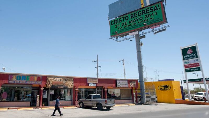 Puis le 21 octobre de la même année Dieu allait détruire l’Univers. Certains Américains ont laissé leur travail pour voyager dans le pays et avertir les autres citoyens de ce qui se préparait. * Sur la photo, un homme marche près d’une affiche annonçant le « Retour de Dieu », placée par le groupe religieux américain Family Radio du prédicateur Harold Camping dans l’une des rues de la ville mexicaine de Ciudad Juárez, à la frontière du Texas, le 20 mai 2011.