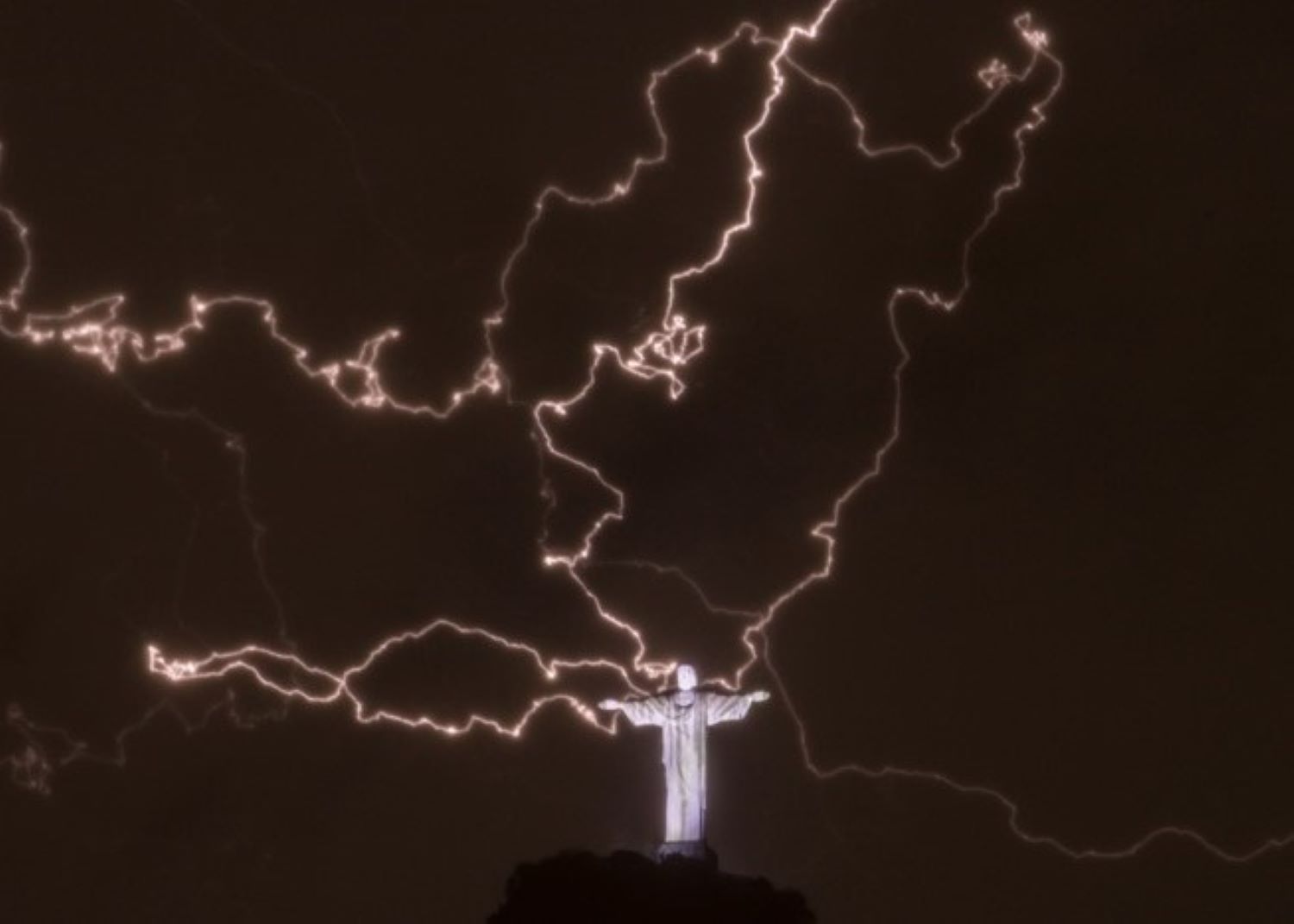 Un éclair éclate au-dessus de la statue du Christ rédempteur, en haut du mont Corcovado à Rio de Janeiro, au Brésil, le 16 janvier 2014.