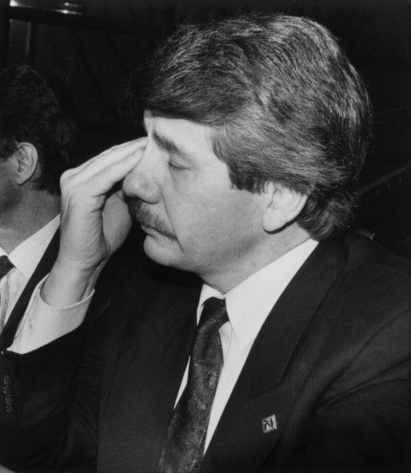 Le maire Jean Doré essuie une larme à la conférence de presse du jeudi 7 décembre 1989. Crédit photo: La Presse canadienne/Shaney Komulainen