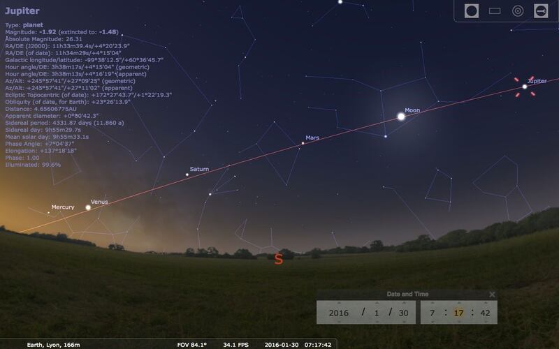 Bien qu'il sera possible de voir les planètes à l'oeil nu, ayez tout de même des longues vues en main... juste au cas! Ces planètes seront alignées de l'horizon vers la Lune suivant cet ordre (de droite à gauche sur les images) : Mercure, Vénus, Saturne, Mars, la Lune et Jupiter.