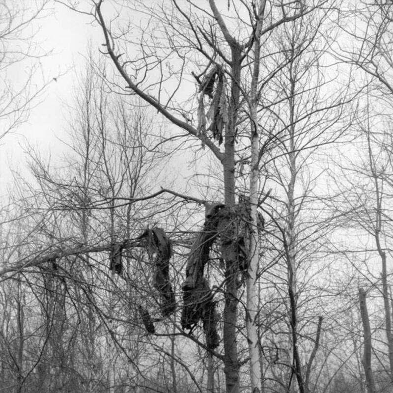 Débris accrochés à des branches d'arbre sur les lieux de l'écrasement d'avion, à Sainte-Thérèse de Blainville, au Québec, en 1963. Crédit photo: Montreal Star/National Archives of Canada/PA-116378