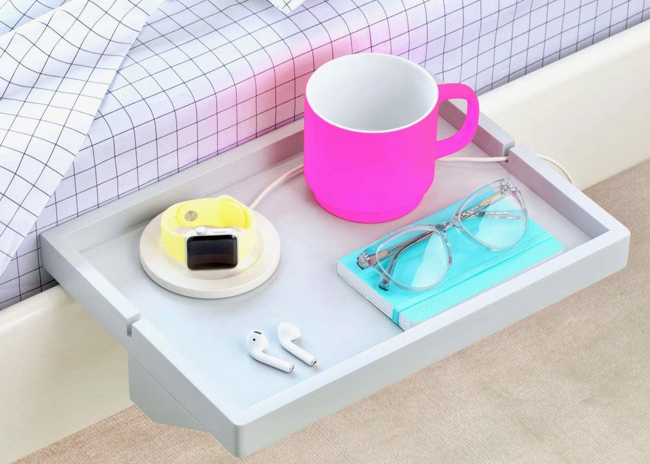 Si vous manquez d'espace dans votre chambre pour installer une table de chevet, cette tablette est parfaite pour y poser téléphone, verre et autres accessoires.