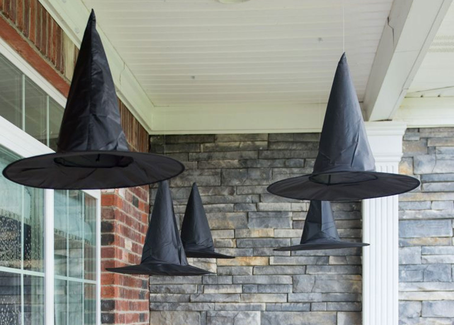 Pour ce DIY, un petit tour au magasin 1$ s'impose. En effet, les chapeaux de sorcière y sont très peu dispendieux et vous y trouverez fil de pêche et tubes phosphorescents pour reproduire une allée de chapeaux flottants lumineux.
