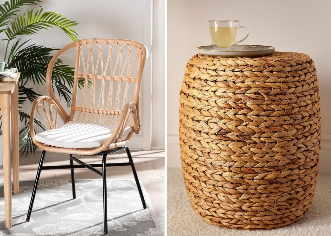 On adore le rotin! Ce matériau délicat s’intègre à merveille dans des décors zen (aux côtés du bambou et de textiles naturels) et rustique (paniers de rotin, tapis tissés, etc.). Le rotin s’harmonise également à merveille aux accents de verdure pour une touche boho chic.