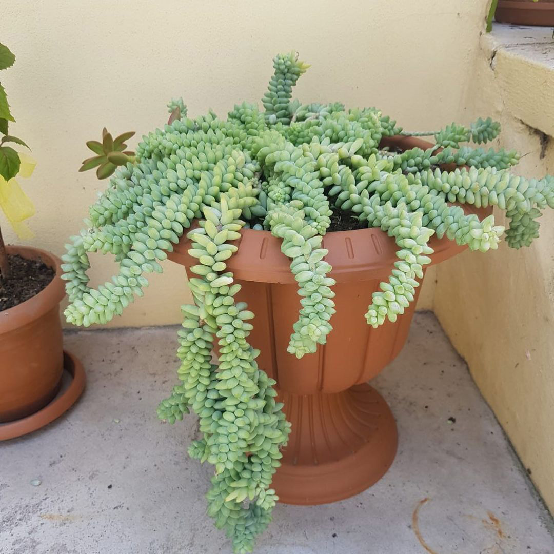 Le sédum se rapproche beaucoup de cette famille de plantes grasses, tout en poussant magnifiquement bien ici sans demander de soins particuliers. On adore son feuillage très vert et luisant qui dure toute la saison.