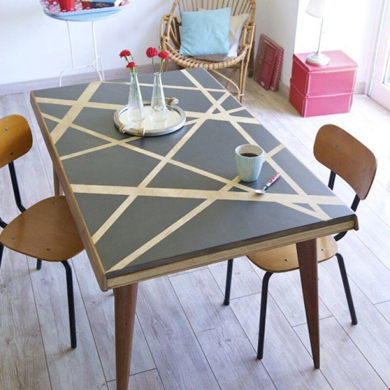 Voici ce qu'on peut obtenir avec un peu d'imagination, de la peinture et du ruban à masquer. Plein feu sur le plateau de cette table aux allures géométriques ultra tendance. Exit la nappe!