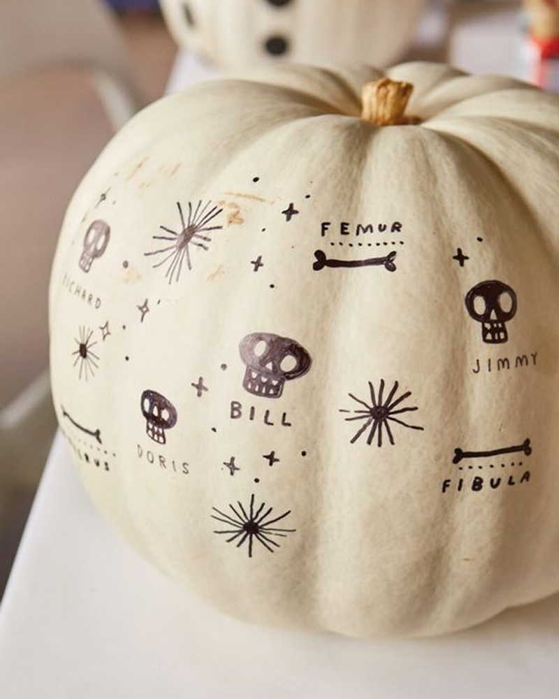 Fan du look minimaliste et habile avec un crayon? Décorez une citrouille en lui dessinant des petites illustrations thématiques à l’aide d’un marqueur permanent! À réaliser sur une citrouille de couleur claire pour un maximum d’effet!