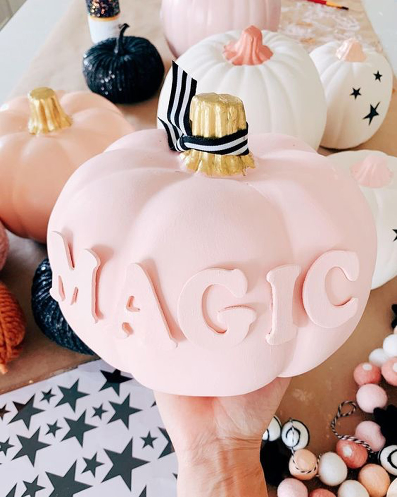 Votre ambiance à la maison est aux couleurs douces et reposantes? Pourquoi ne pas réaliser des éléments décoratifs qui s’y intègrent parfaitement? On aime beaucoup le jeu de couleur ton sur ton du mot «magic»! Un concept à reproduire sur plusieurs citrouilles histoire de faire un effet de groupe! Mignon comme tout!