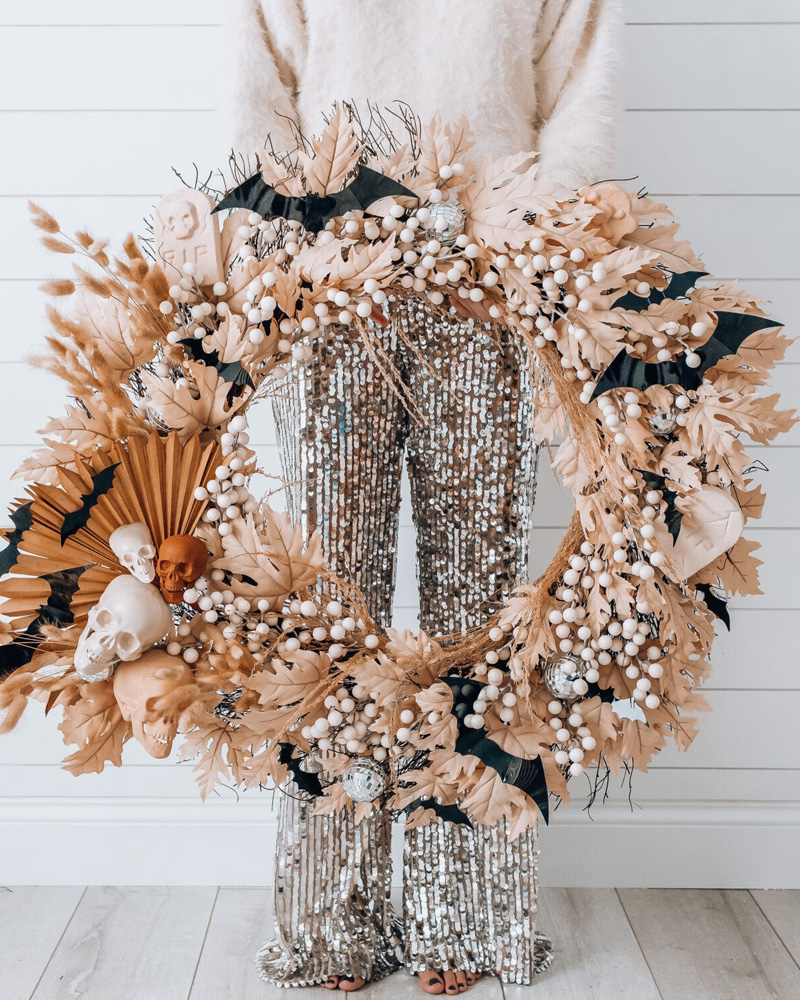 Histoire de donner un joli coup d’œil à votre porte d’entrée, réalisez cette jolie couronne à partir de pampas et de feuilles séchées! On adore le look boho-chic de cette couronne et les couleurs chaudes et neutres qui sont parfaites pour la saison automnale! Couronnez le tout de petites chauves-souris pour un look 100% Halloween et le tour est joué!