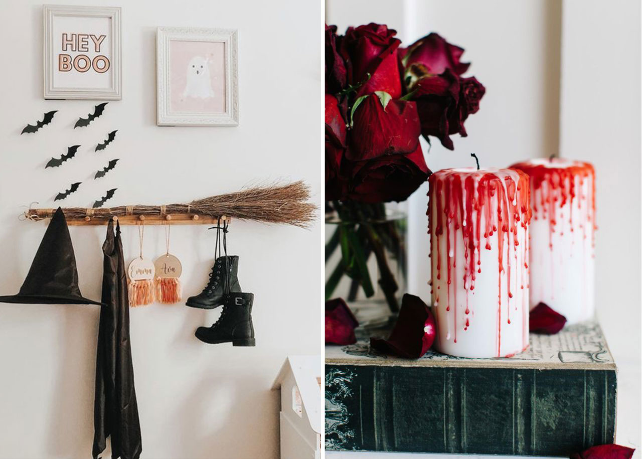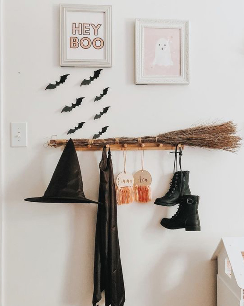 Envie de joindre l’utile à l’agréable? Servez-vous d’un balai de sorcière (que vous pouvez très certainement trouver dans l’allée des costumes d’Halloween au magasin du dollar) pour décorer un coin de rangement mural que vous avez déjà chez vous! Vous pouvez ensuite y suspendre quelques objets décoratifs thématiques afin de couronner le tout! De la déco d’Halloween qui sert également de rangement? Oui s’il vous plaît!