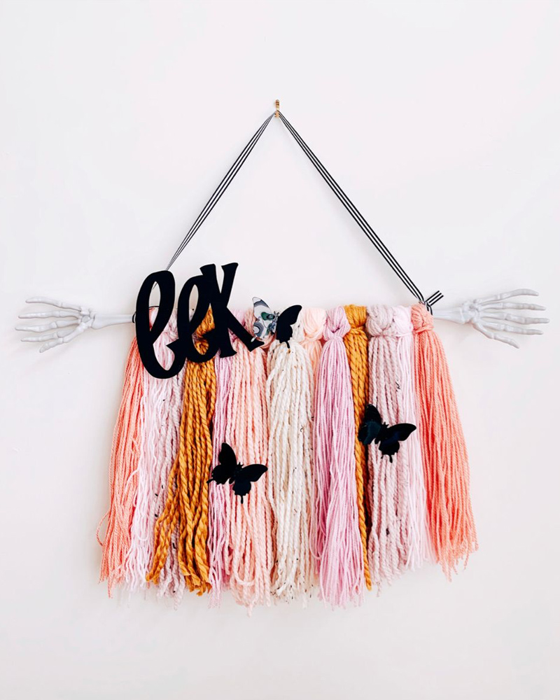 Fans du style bohémien? Ce DIY est pour vous! Réalisez cette jolie déco murale de style macramé à l’aide de morceaux de laine colorée et d’un morceau de squelette! On aime l’agencement des couleurs et le petit détail «EEK» qui lui donne un look 100% festif!