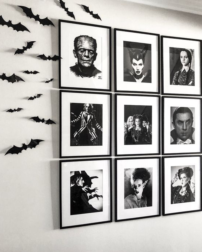 Vous avez un mur rempli de cadres décoratifs? Donnez-lui une petite touche effrayante en interchangeant des photos par des clichés épeurants! Scènes de films d’Halloween classiques, paysages épeurants ou encore photos de vos anciens costumes d’halloween peuvent parfaitement faire l’affaire!