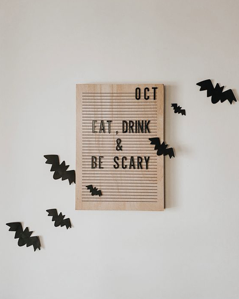 Si vous disposez d’un petit écriteau similaire chez vous, vous pouvez certainement l’utiliser pour agrémenter votre déco d’Halloween! Inscrivez-y une phrase thématique et déposez des petits accessoires comme des petites chauves-souris en papier ou en feutre pour finaliser le tout! Simple et minimalise, mais super efficace!