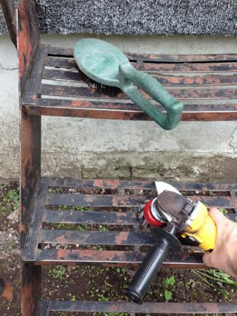 2. Éliminer la rouille Faites disparaître toute trace de corrosion avec une rectifieuse à angle (aussi appelée grinder) et une brosse en métal. Assurez-vous de bien gratter la vieille peinture pour bien faire adhérer la peinture fraîche.