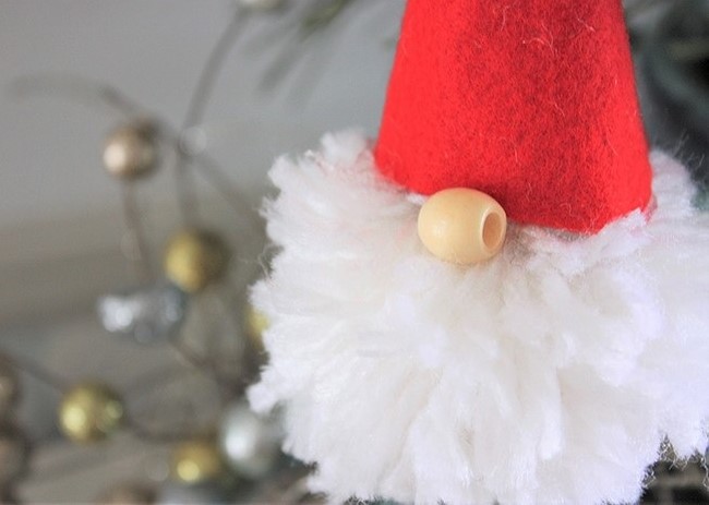 7. En guise de nez, coller une petite bille de bois sur le pompon de laine