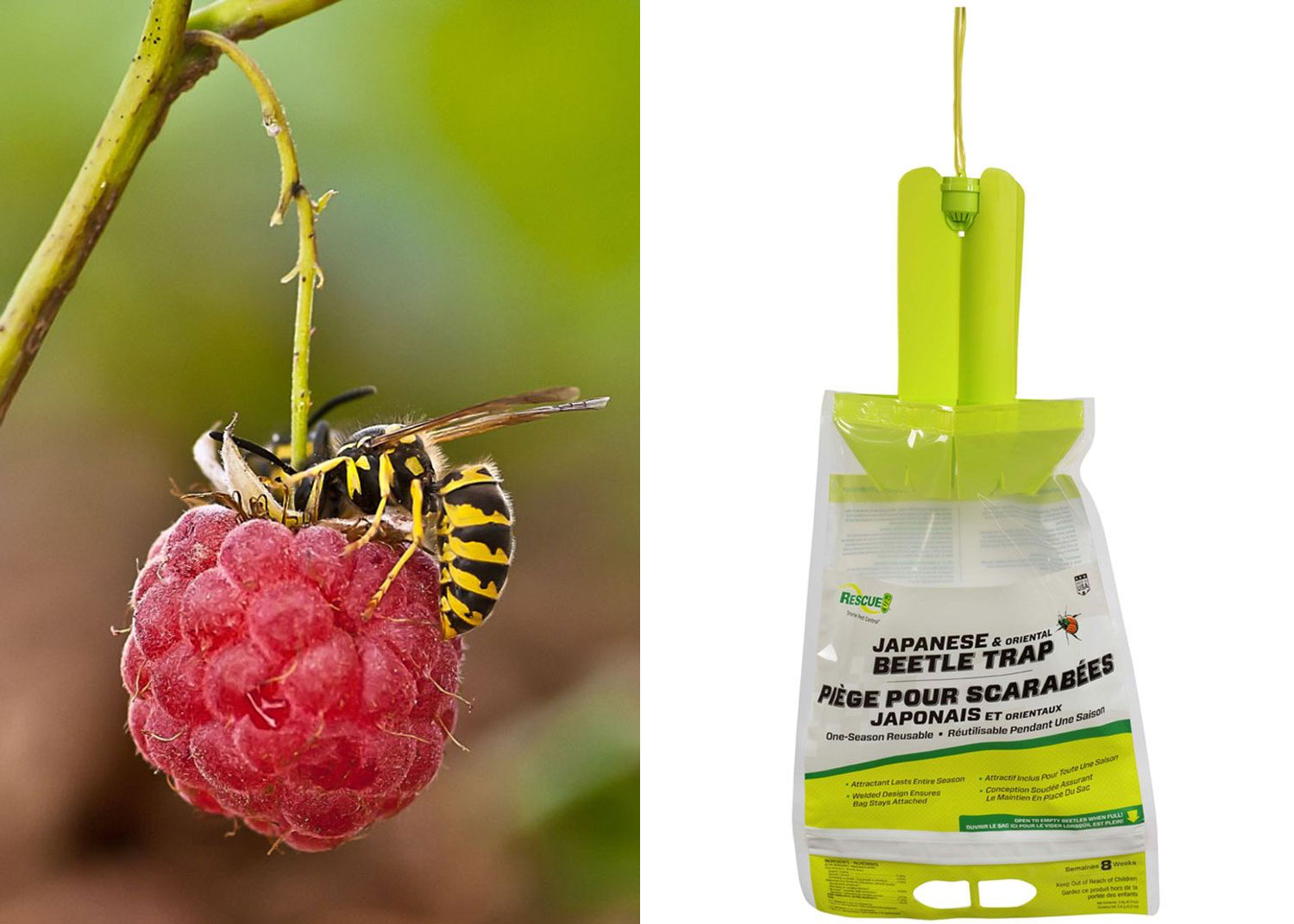 Le meilleur moyen pour les attraper est d’installer des pièges physiques, sous la forme de gros sacs surmontés par une pastille contenant des phéromones à scarabée japonais qui les attirent. C’est très impressionnant (et un peu dérangeant) de les voir s’y diriger et s’y jeter par centaines!