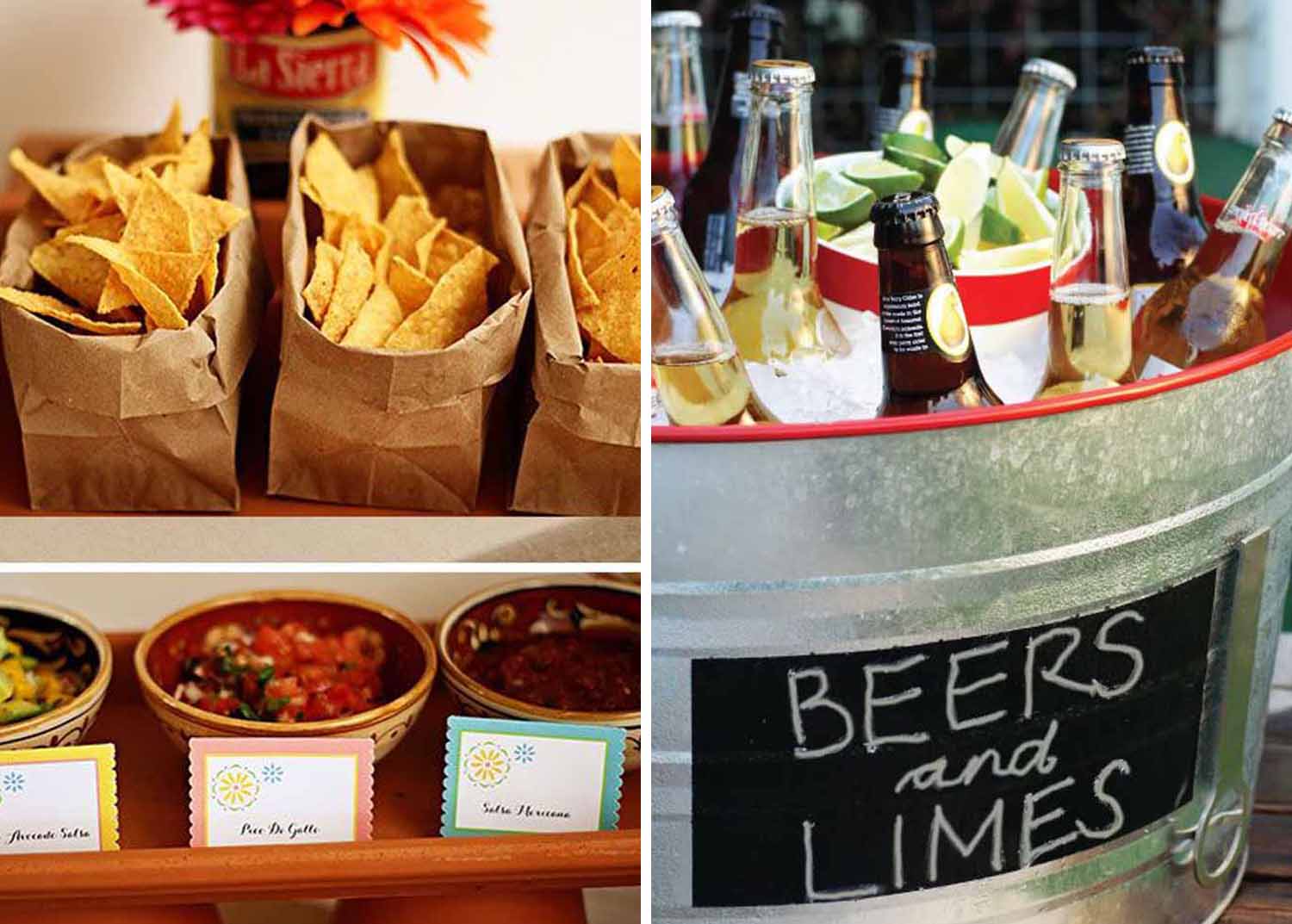 - Des sacs de papier brun remplis de chips tortillas servies avec une variété de salsas (salsa de tomates, guacamole, trempette de fromage, etc.);