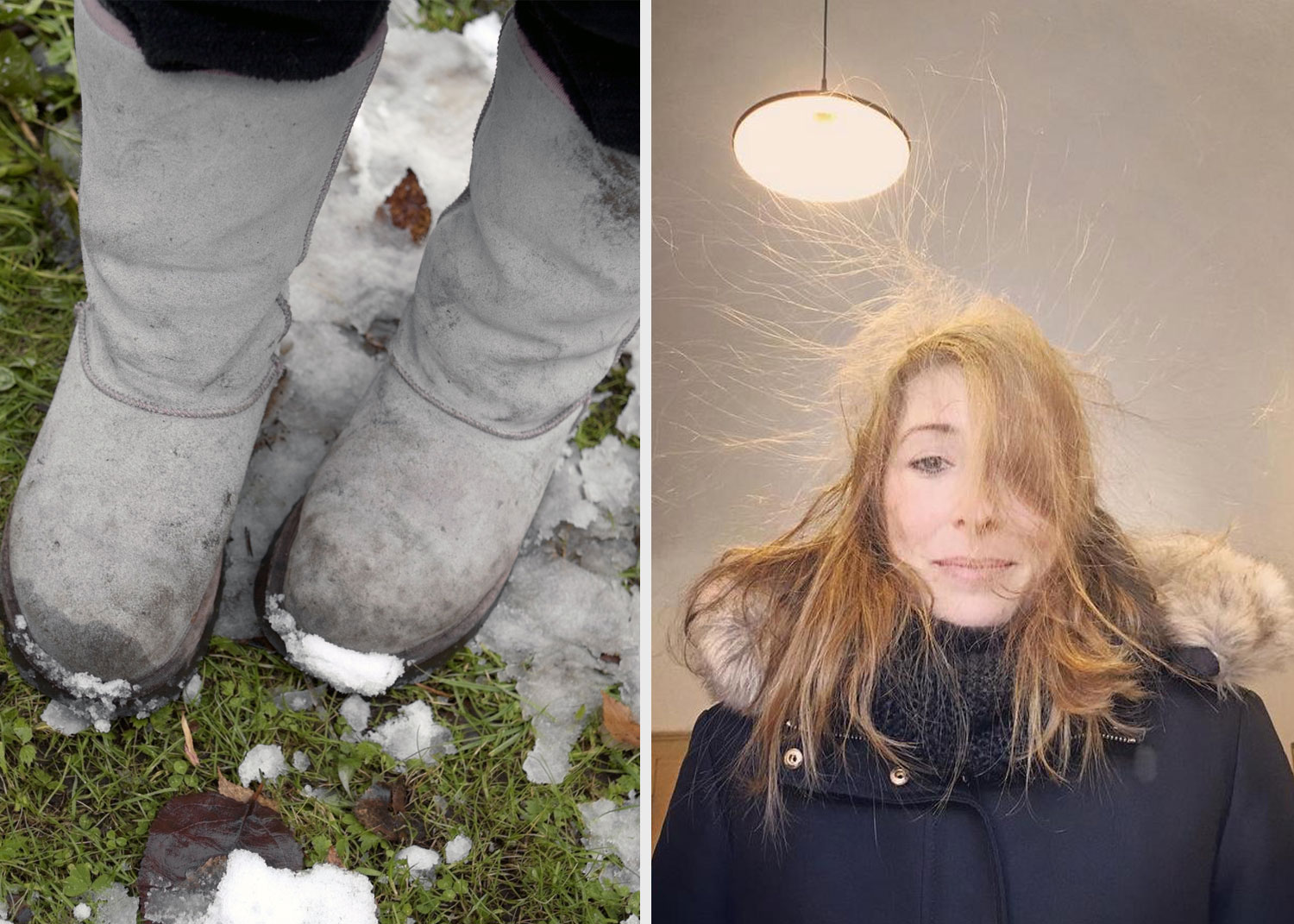 Laine + matériaux synthétiques + chauffage électrique = plein de statique! En cas d’attaque soudaine, on traine toujours une feuille d’assouplisseur textile qu’on peut passer rapidement sur les vêtements (ou les cheveux) au besoin.