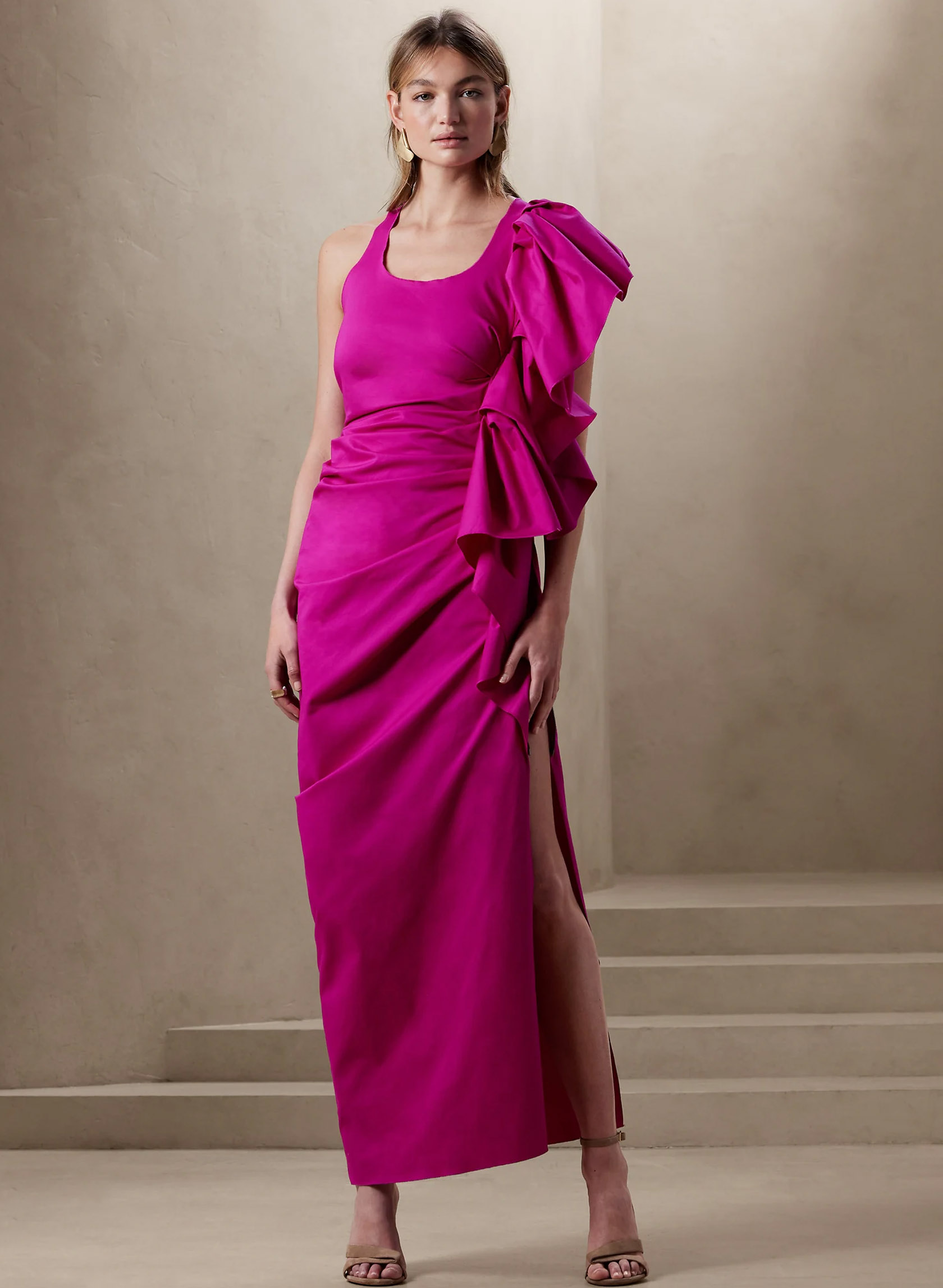 Le fuchsia est l’une des couleurs tendance de la saison. L’énorme volant couplé à la jambe fendue donne un look ultra glam à cette robe. Le plissé à la taille sublime la silhouette.