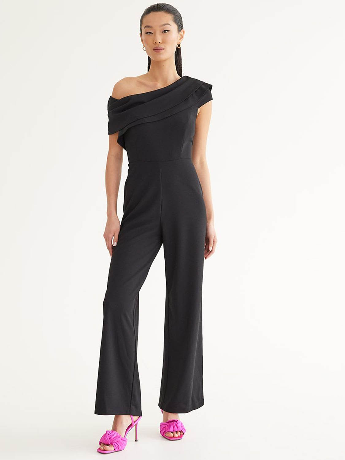 Vous n’êtes pas à l’aise en robe? Cette combinaison est toute aussi chic! Comme elle est noire, vous pourrez vous amuser avec des accessoires colorés, comme des chaussures fuchsia.
