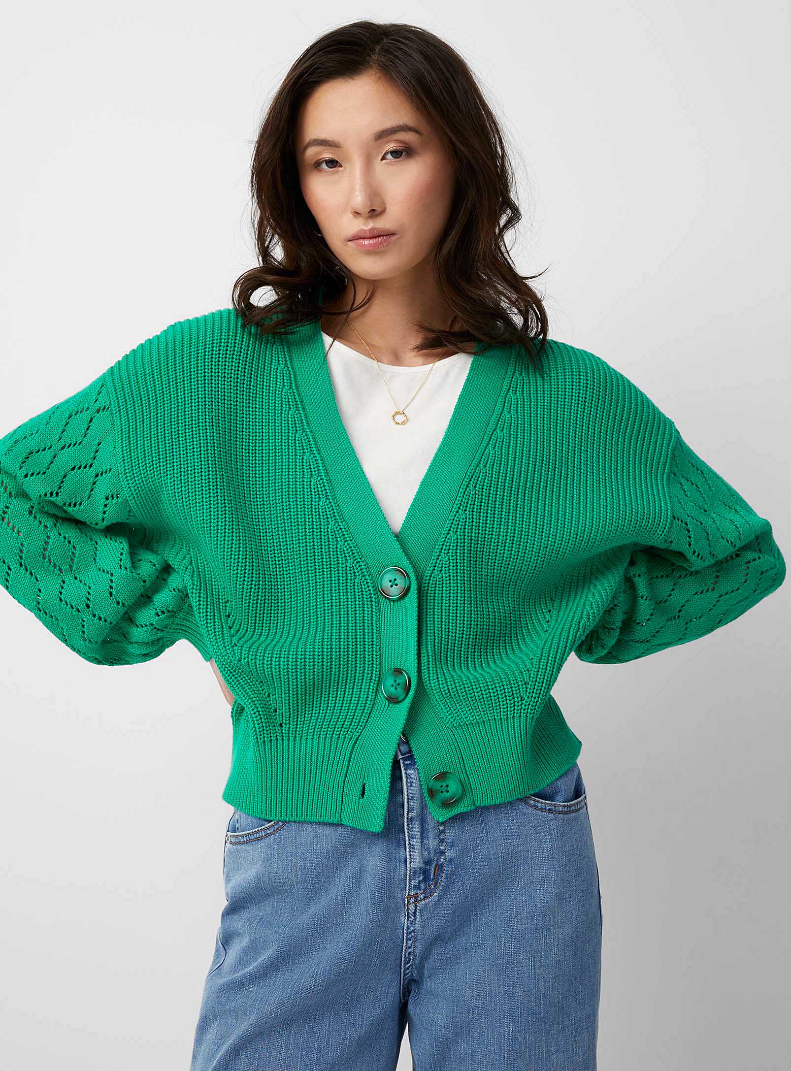 Le cardigan est la pièce par excellence pour les layerings saisonniers. Il permet de traverser les changements de saison avec style. La couleur émeraude de celui-ci ajoute un peu de vitalité à la garde-robe. Il se porte avec tout, de la robe au jean, en passant par le t-shirt et le pantalon habillé.