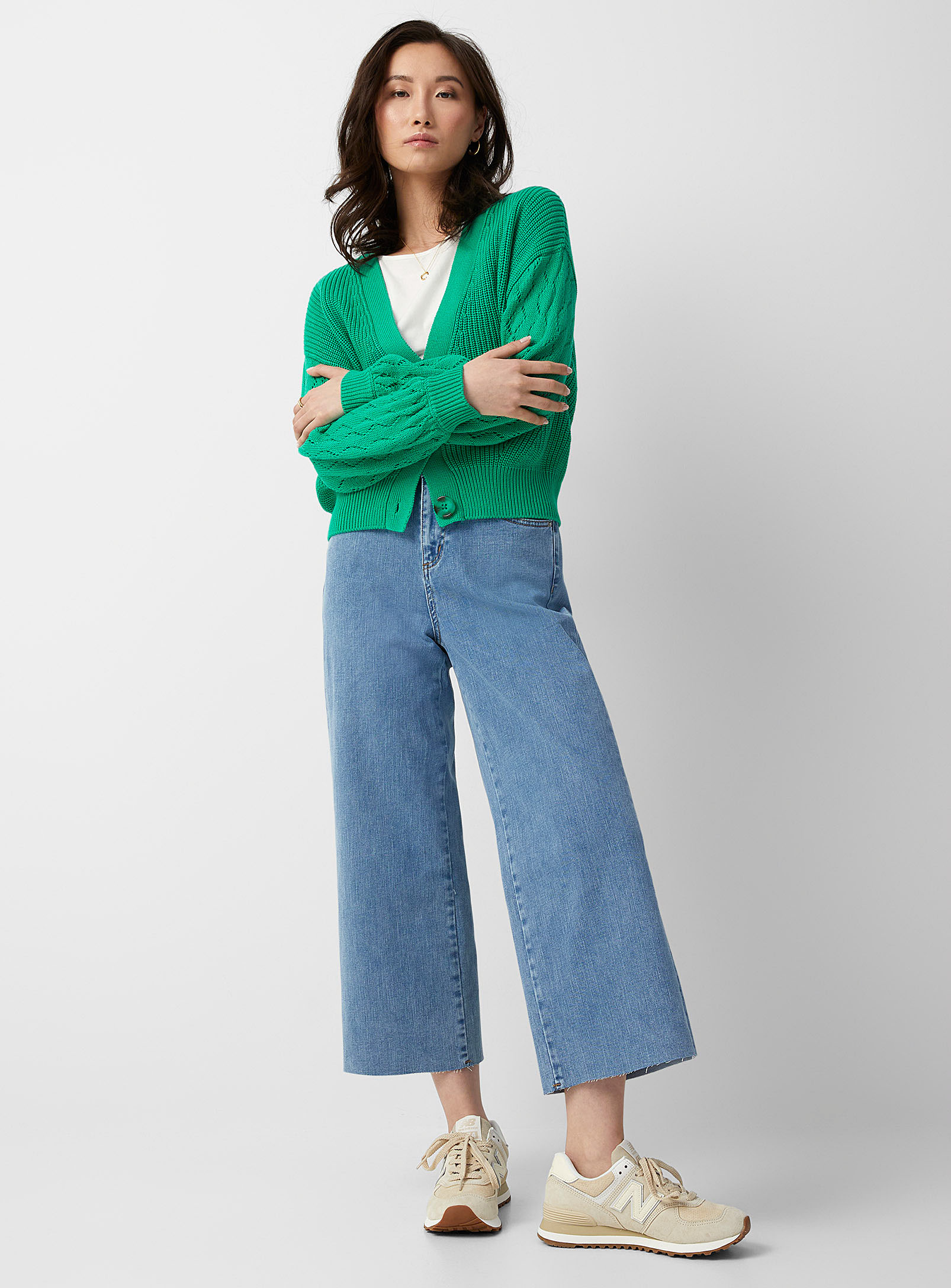 Le jean à jambes larges est l’une des pièces clées de la saison. À l’approche des températures plus clémentes, on choisit toutefois un modèle écourté, qu’on portera tant avec des espadrilles qu’avec des bottillons à talon haut.
