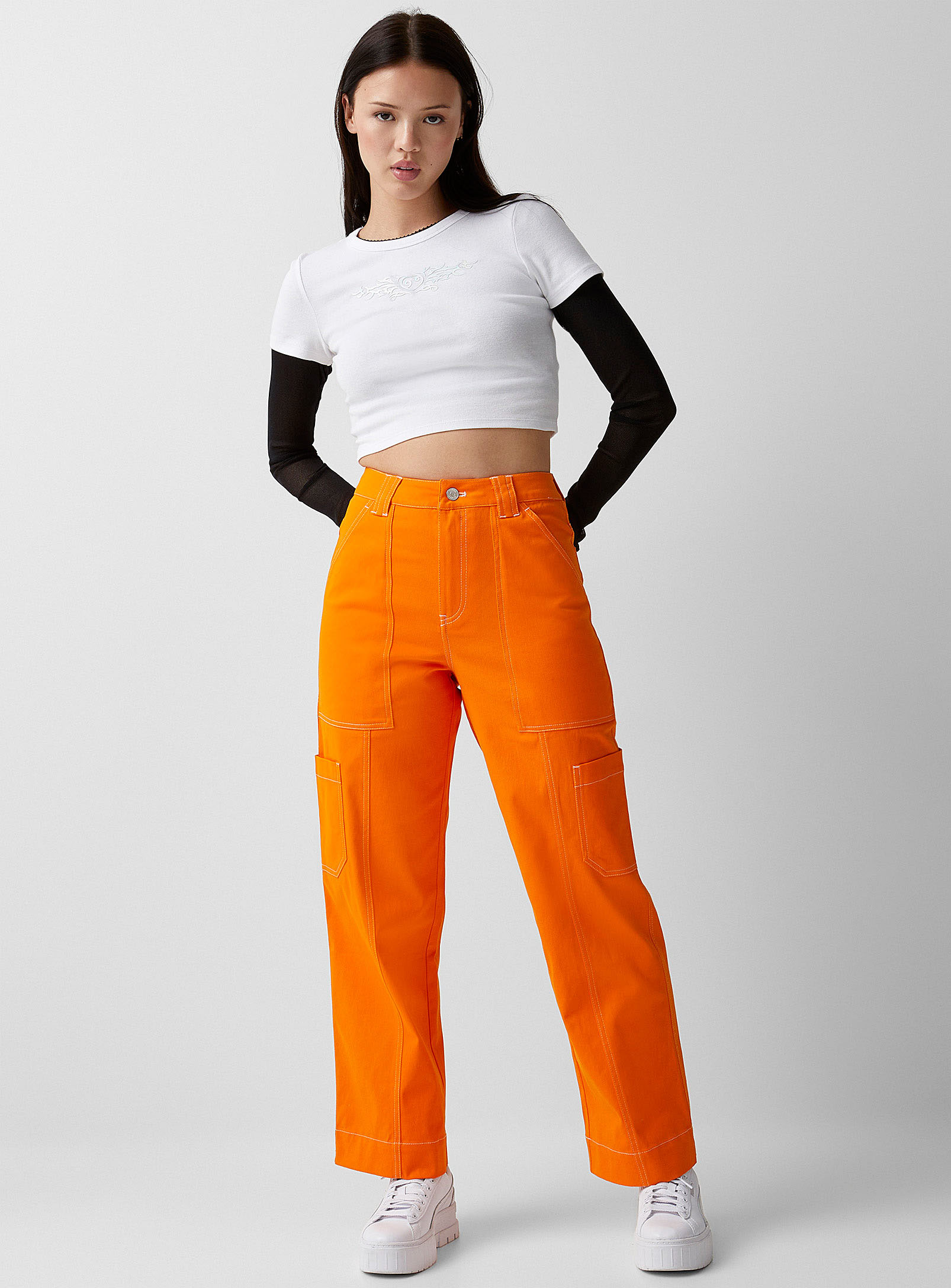 Le pantalon cargo fait lui aussi un retour en force cette saison. On portera celui-ci avec un pull écourté ajusté et des bottillons à talon haut pour le féminiser.