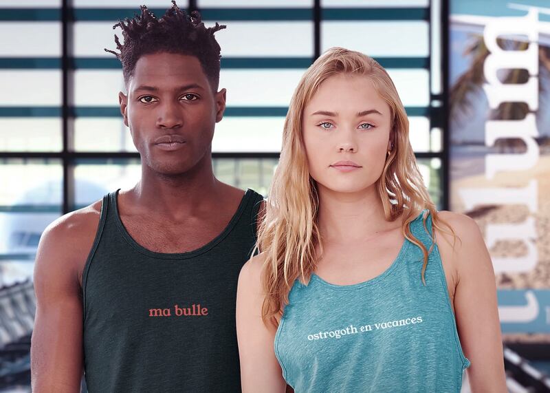 Parmi tous les modèles, celui qui est probablement le plus temporel est la camisole « ostrogoth en vacances », faisant référence au tristement célèbre party d'influenceurs québécois dans l'avion commenté par Justin Trudeau :