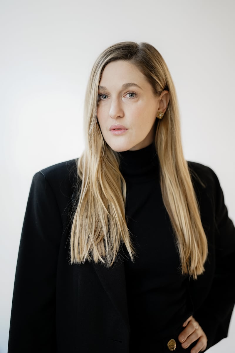 Pour le visionnement de presse de sa nouvelle série Casse-gueule, la comédienne a opté pour un veston noir et un pantalon tailleur à jambe large. Elle a agencé son complet intemporel avec un col roulé du même ton, donnant une touche années 70 à son ensemble.