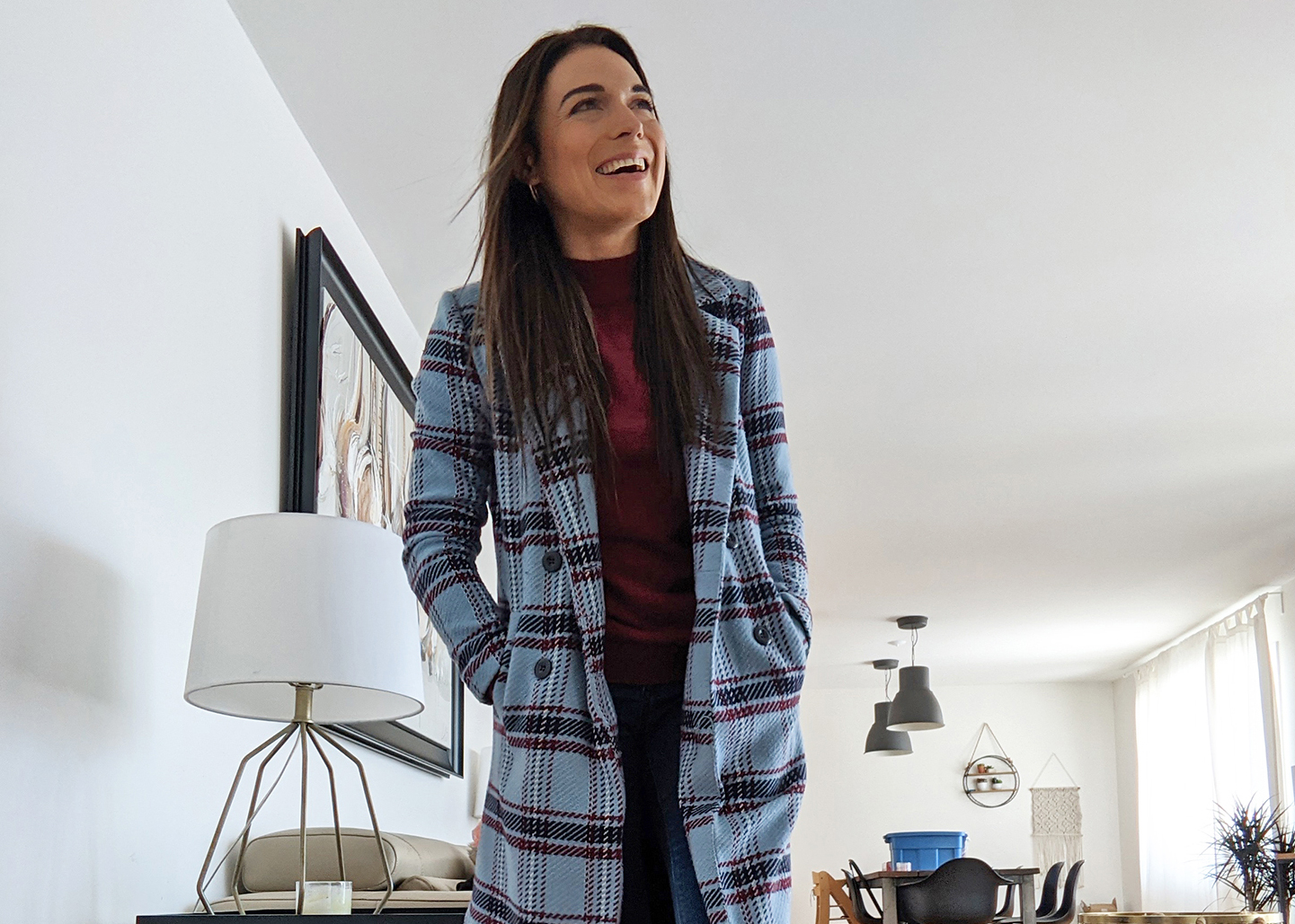 « J'aime l'aspect à la fois et cozy et professionnel de cet outfit. Il donne un air plus soigné en surface, mais la touche de bourgogne apporte une belle dose de punch. La chaussure avec noeud sur le dessus me fait complètement craquer; elle donne un look féminin tout en ayant le confort de l'espadrille. En plus, comme les temps demeurent parfois frais en début de printemps, rien comme un joli manteau propre à carreaux pour agrémenter les marches extérieures avec style! »