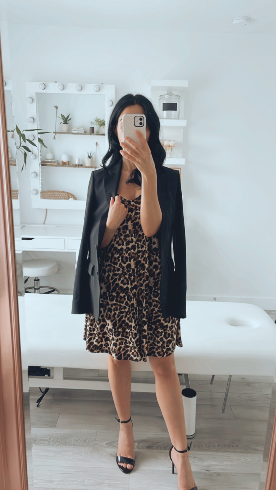 Cette petite robe léopard fait à elle seule le look, mais je me suis amusée à l’accessoiriser avec une ceinture à la taille, un veston noir et des sandales à talons hauts. La parfaite tenue pour une date!