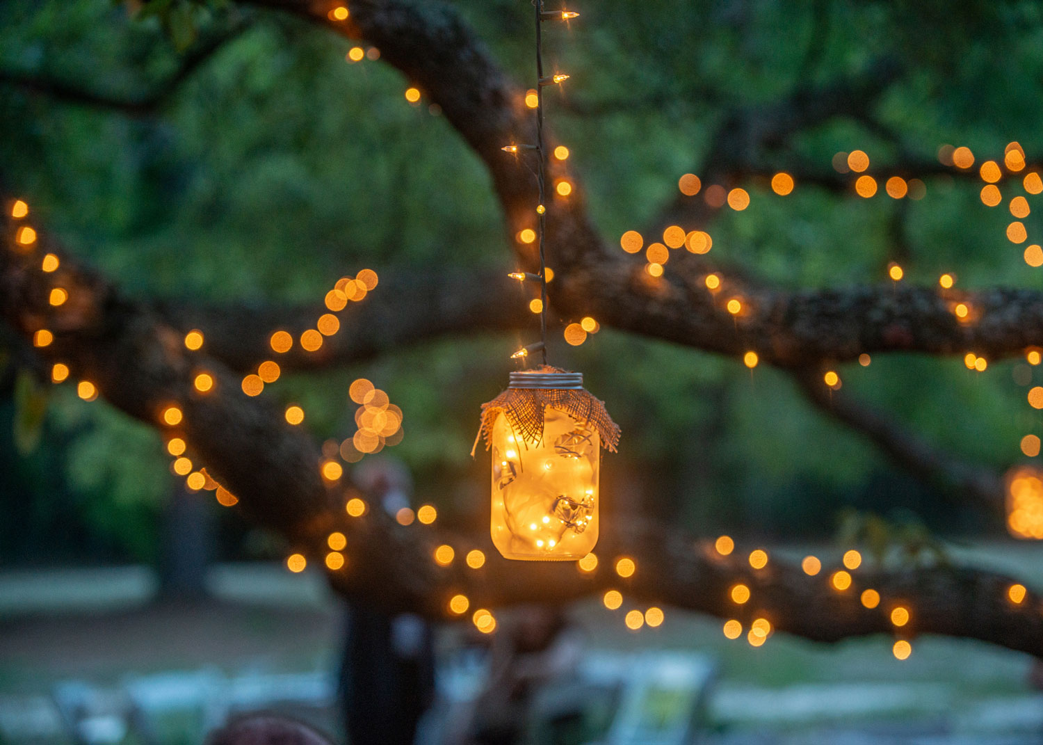 4. Utilisez les bons vieux pots à conserve Mason pour vous faire des lanternes. Vous n'avez qu'à y déposer un peu de sable au fond, puis une bougie ou des guirlandes de lumières au DEL. Placez-en ensuite partout dans la cour: déposez-en dans les plates-bandes, autour de la piscine, sur la table et même suspendus dans les arbres. Plus il y en a, plus l'effet sera féerique le soir venu. On peut remplacer les vraies bougies par des bougies au DEL, surtout s’il y a des enfants parmi les invité.e.s.