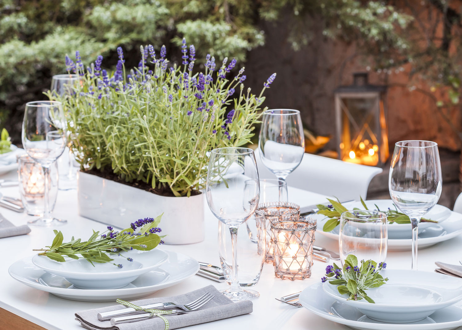 Les éléments naturels sont gratuits et ajoutent une touche authentique et tellement chaleureuse. Utilisez des fleurs sauvages ou coupez-en quelques-unes de vos plates-bandes, disposez ici et là des branches, des galets ou des feuilles comme décoration de table. Un bouquet de fleurs du jardin comme ce pot rempli de lavande ci-haut, peut servir de magnifique centre de table en plus de sentir bon comme tout.