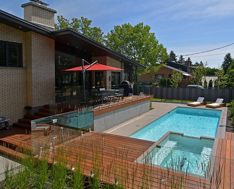 Qui a dit qu'il était impossible d'avoir une piscine dans une petite cour? Ici, le patio aux allures contemporaines est en hauteur et il crée un petit cocon à l'abri des regards. En effet, en plus de rendre la piscine sécuritaire, il permet l'installation d'un mur d'intimité...ce qui n'est pas de refus en ville, lorsque les voisins sont proches.