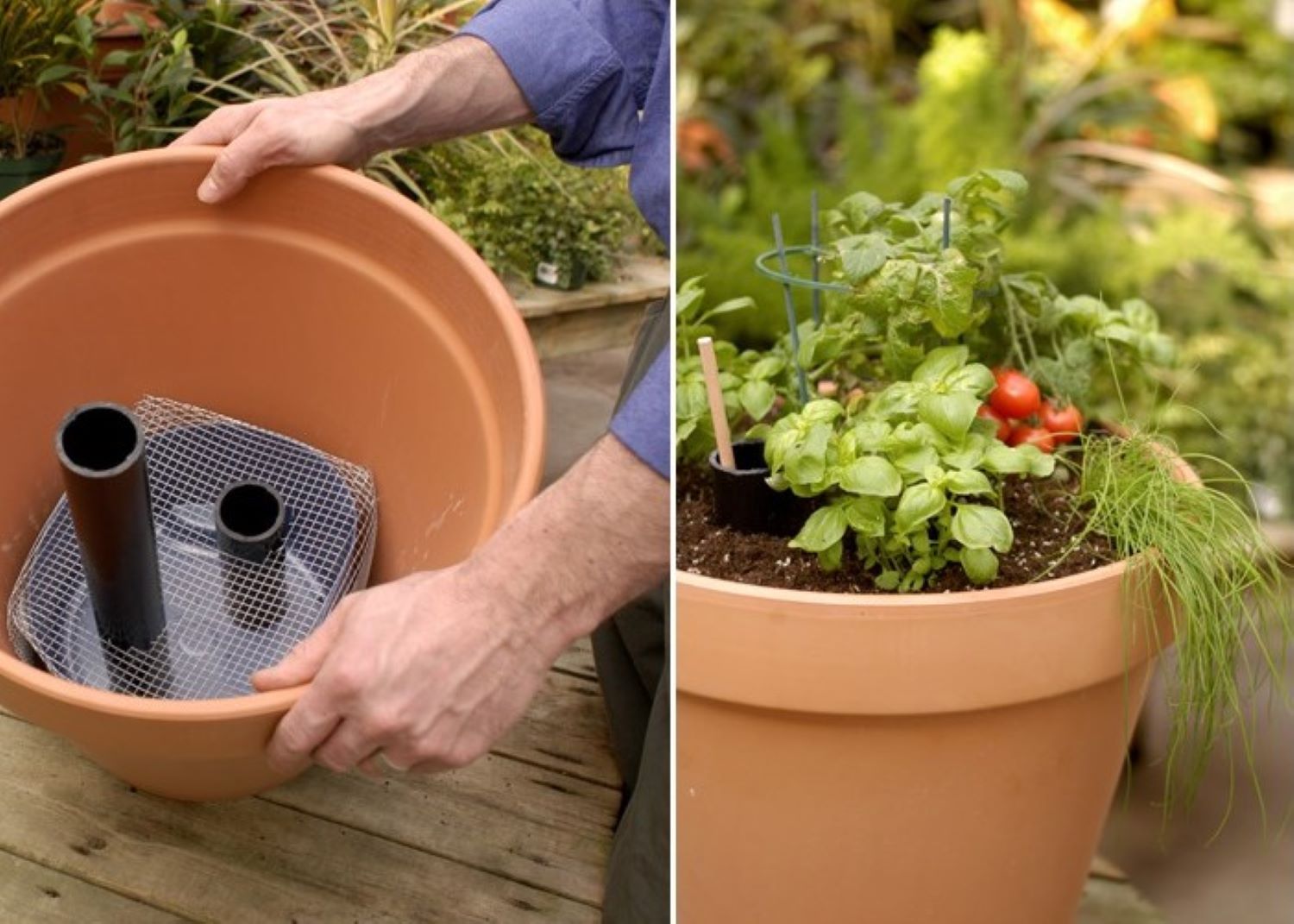 À l'aide d'un bocal, d'un morceau de grillage et d'un bout de tuyau, vous pouvez, assez facilement, transformer n'importe quel pot en un contenant à auto-arrosage. Quel que soit le pot choisi, il doit avoir au minimum 40 cm (16 po) de diamètre.