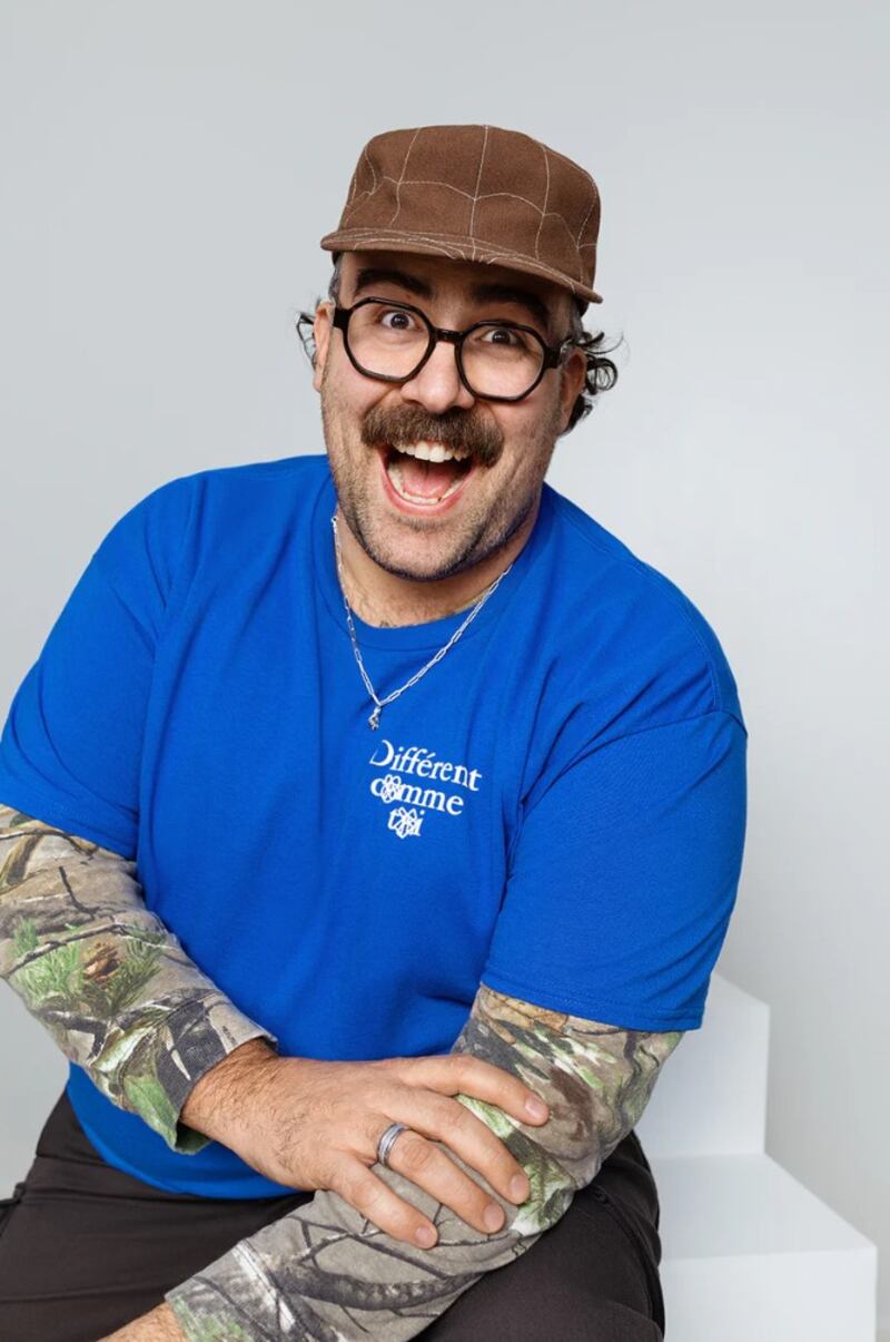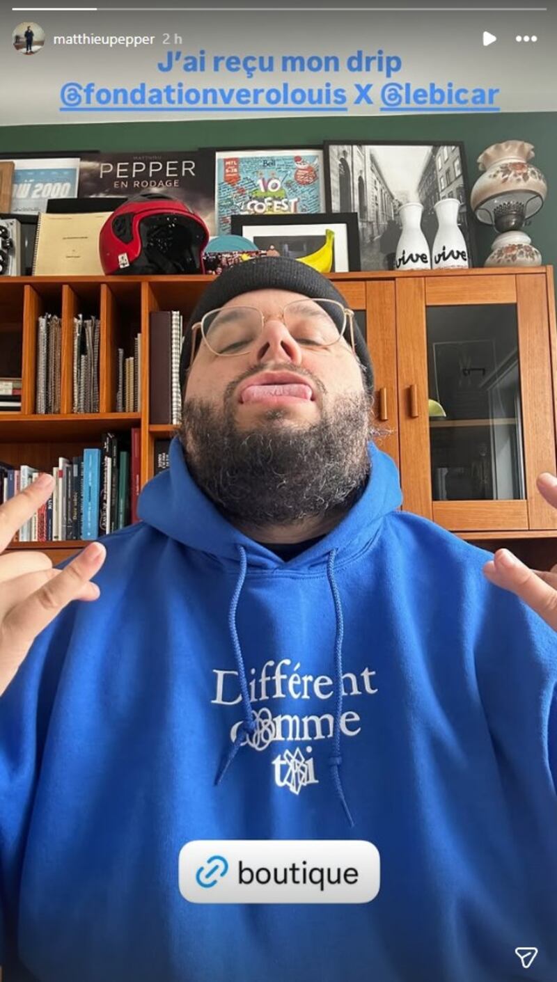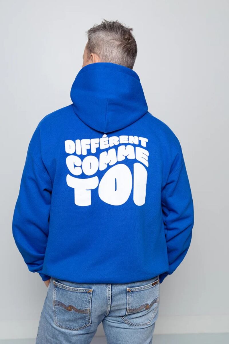 Il s’agit de l’artiste LeBicar qui a eu comme mission de créer les nouveaux designs de la collection de vêtements de la campagne Différent comme toi pour la Fondation Véro & Louis. Cette année, la couleur principale de la collection est le bleu.