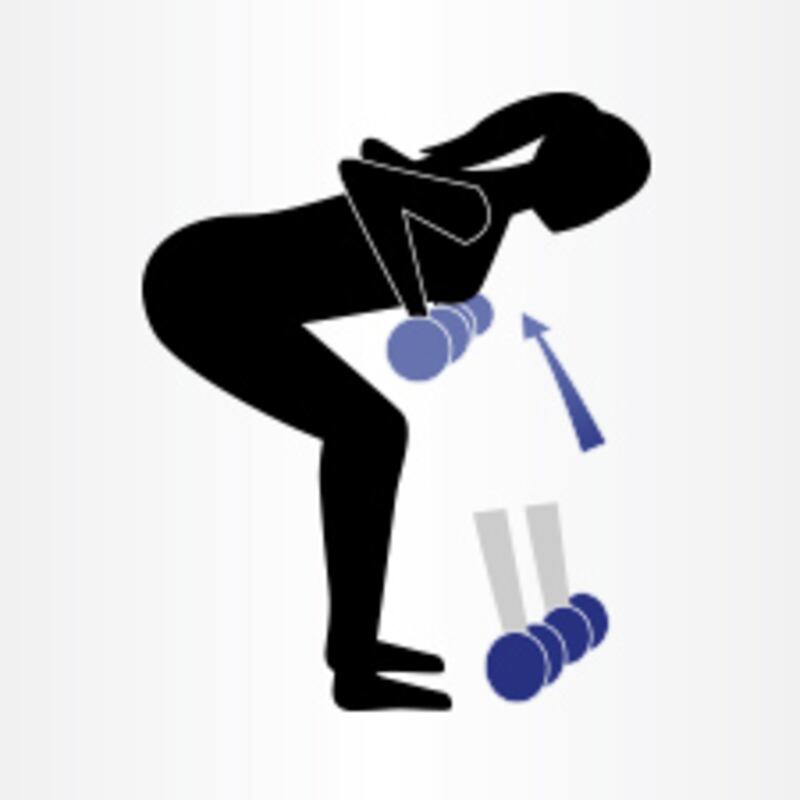 1. Un haltère dans chaque main, le buste penché vers l'avant.