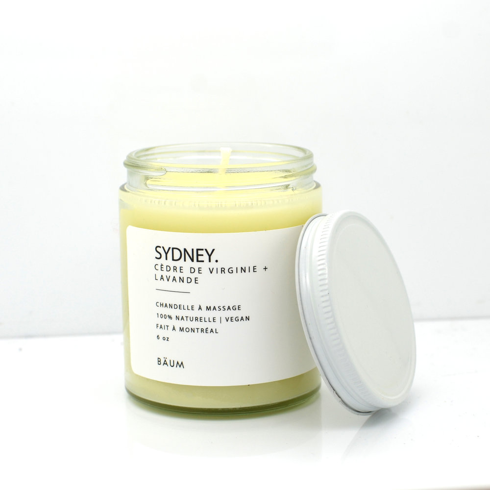 C’est une chandelle, mais c’est aussi une huile à massage et un baume hydratant! La chandelle biodégradable brûle lentement et laisse une douce odeur de cèdre de Virginie et de patchouli avec des effluves d’agrume et de lavande. Une fois refroidi, ce qu’il reste de la chandelle pourra servir de baume pour le corps et d’huile de massage.