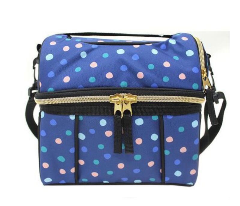 Une boîte à lunch à deux étages! Les deux compartiments permettent de séparer les aliments chauds des froids. On aime la poignée, la courroie et le tissu résistant.