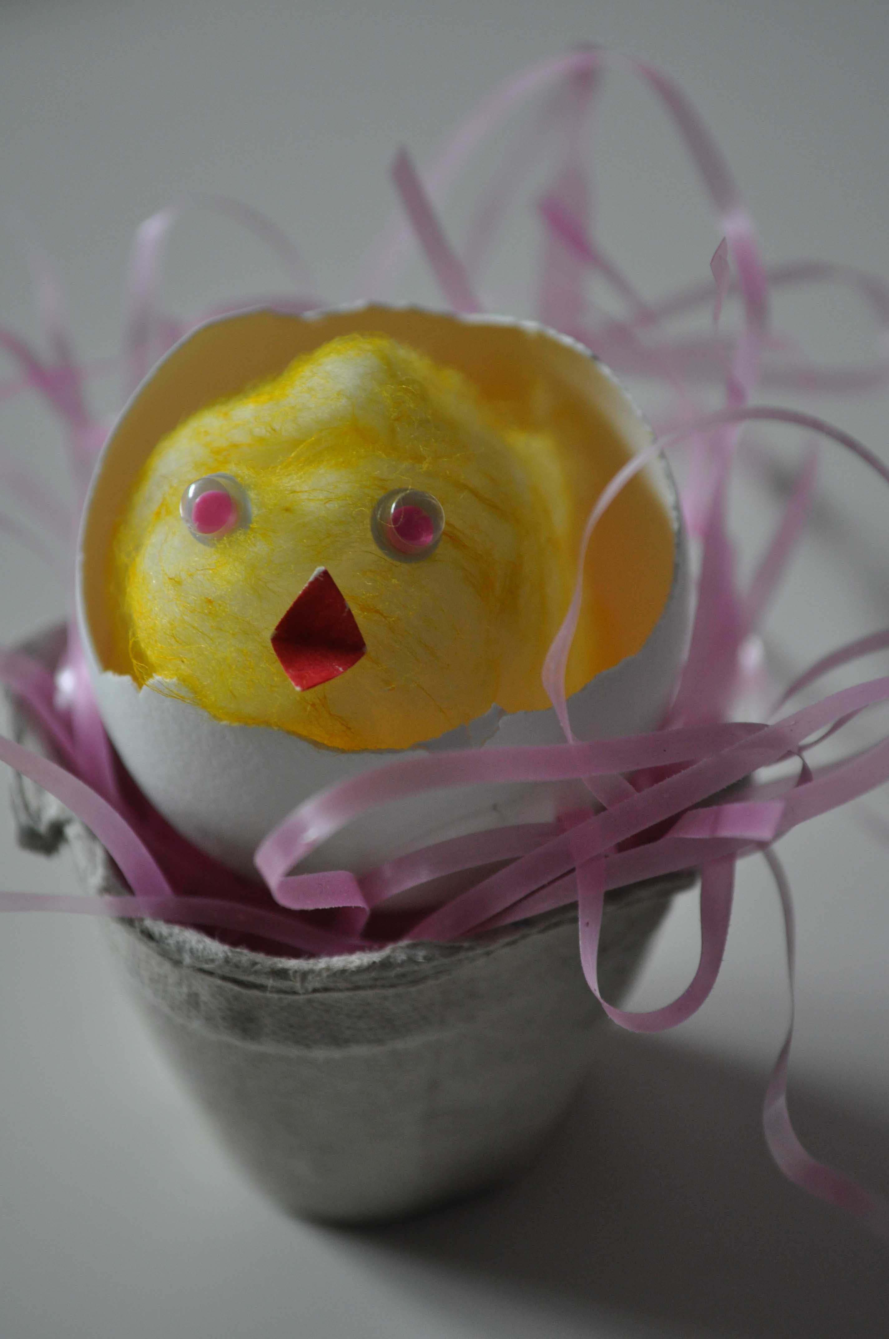 Colorez votre ouate en jaune. Découpez un petit bec dans du papier de construction, soit un losange plié en deux. Collez-le sur la ouate. Ajoutez-y deux petits yeux. Avec une goutte de colle liquide, collez la ouate dans le fond de la coquille. Découpez l’un des trous d’une boîte d’œufs vide, placez-y un peu de paille de Pâques et ajoutez-y votre coquille. Vous obtenez un beau petit nid avec un poussin qui vient de naître.