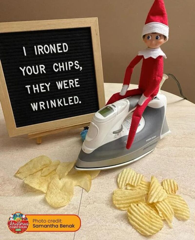 Installez le lutin à califourchon sur le fer à repasser (froid, évidemment) devant la pile des croustilles normales pour donner l’impression que le lutin les a rendues plates.
