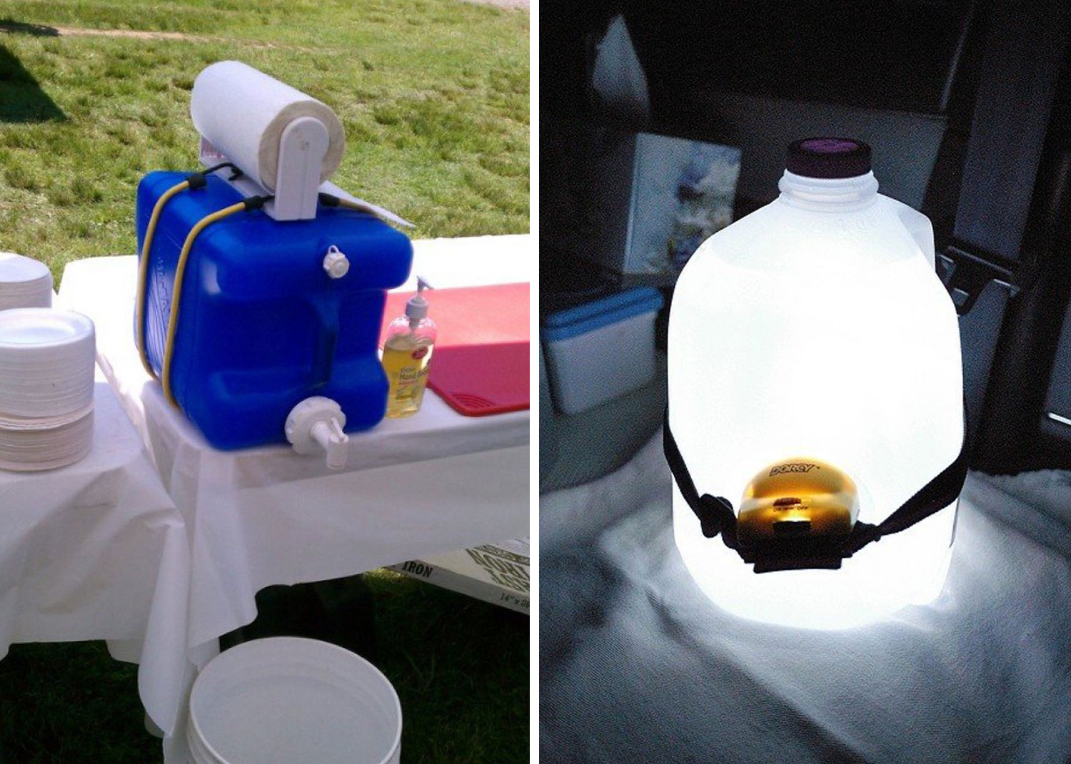 Une lampe de poche, ça rend service, mais ça n’éclaire pas beaucoup. Pour obtenir un éclairage plus diffus qu’un faisceau lumineux, il suffit d’apposer une lampe frontale sur un gallon d’eau. Prenez soin de diriger la lumière vers l’intérieur de la bouteille.