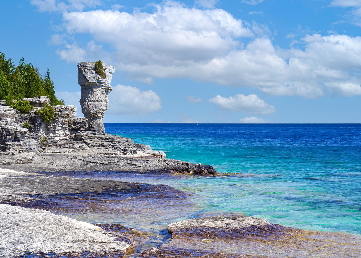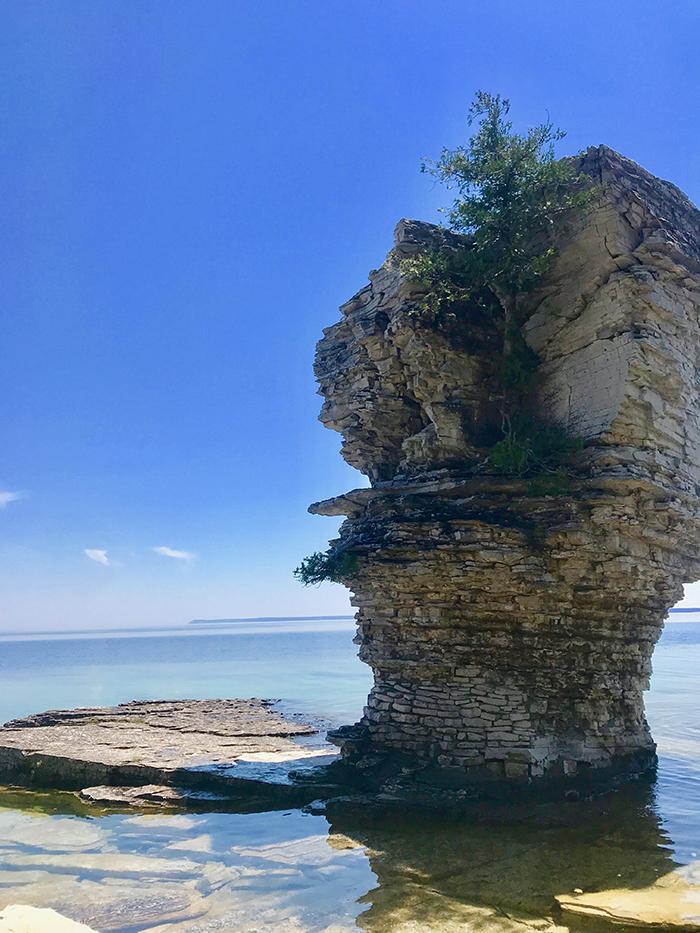 Sur cette île paradisiaque, un sentier de randonnée offre divers points de vue et des arrêts sur les plages de roches, les eaux émeraude du lac Huron et les fameux piliers rocheux aux formes inusitées. Un petit et un gros «pot de fleurs» qui m’ont personnellement rappelé de beaux paysages admirés en Thaïlande.