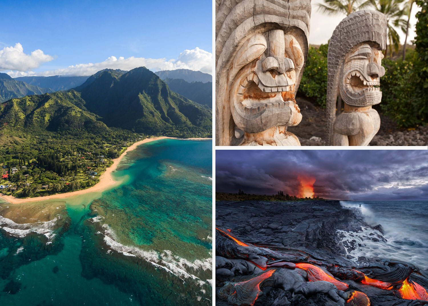 La Grande île est une île toute jeune, moins d'un million d'années, née de la rencontre de cinq volcans: le Kohala, l'Hualalai, le Mauna Loa, le Mauna Kea et le Kilauea, le volcan le plus actif de la planète! Elle offre des paysages d’une diversité folle: pics enneigés et forêts luxuriantes, plages de sable noir et champs de lave désolés, plantations de café et stations balnéaires.