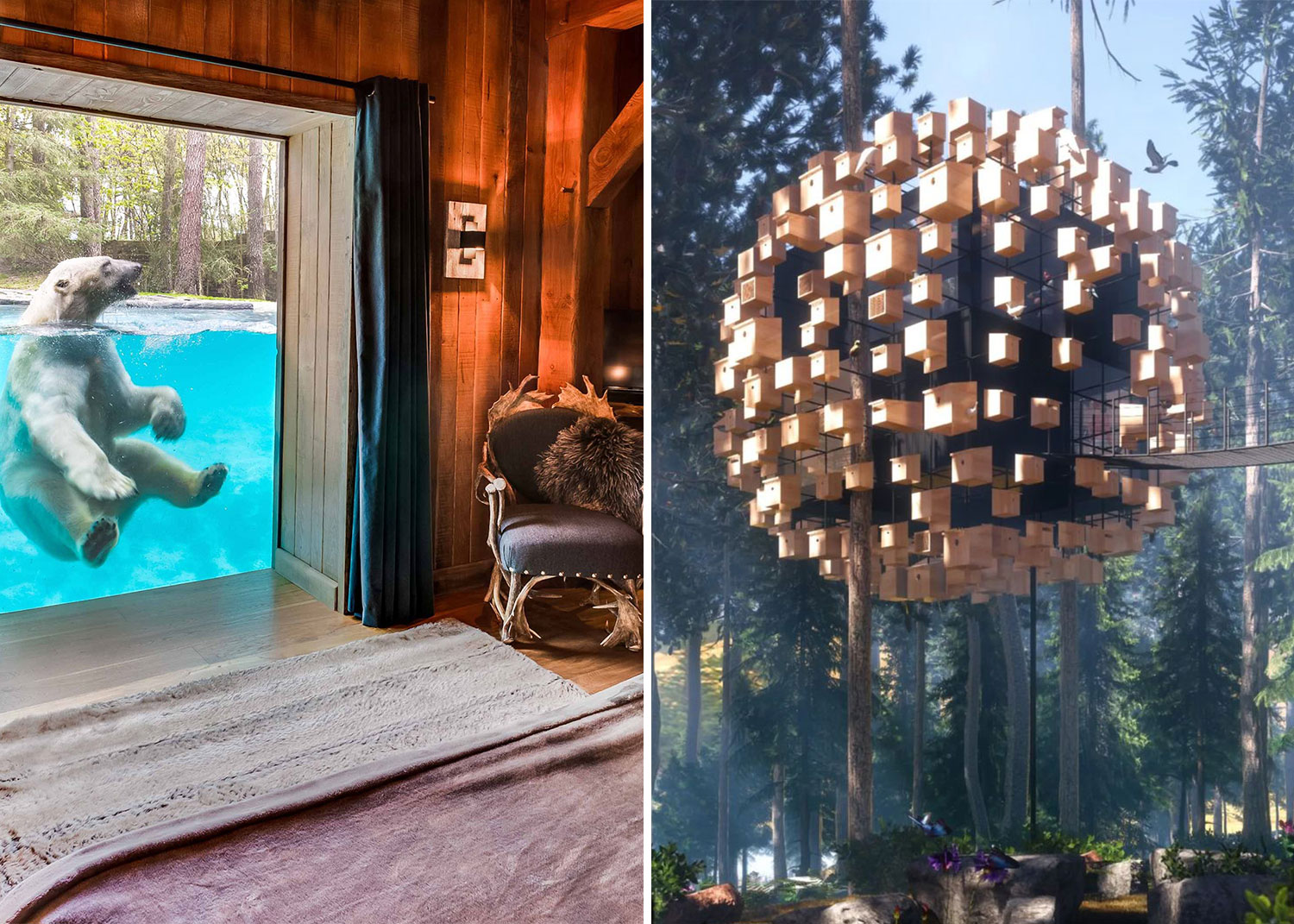 Vous aimez les ours polaires? L’Arctic Lodge est celle qu'il vous faut. Pas peur des lions? La Kwanza Lodge vous accueillera avec plaisir. Amoureux des lémuriens, grizzlis, loups blancs et tigres: des chambres vous donneront aussi un accès inédit à ces animaux sauvages. Le réveil avec l'ours qui vous regarde risque d'être inoubliable!