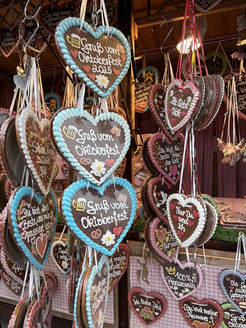 Au cœur des allées animées, notre duo s’essaie à des jeux d’adresse comme la carabine à plomb, une activité typiquement présente dans les foires bavaroises. Any et Deymien ont tous deux remporté un prix! Wow! Entre deux parties, difficile de résister à l’appel des collations typiques: bretzels sucrés, pommes d’amour, crêpes épaisses et les célèbres lebkuchenherzen, ces cœurs en pain d’épices décorés de messages tendres. Pas toujours facile de comprendre la signification des messages sur les biscuits en cœur, mais qu’à cela ne tienne, Deymien en offrira un à Any!